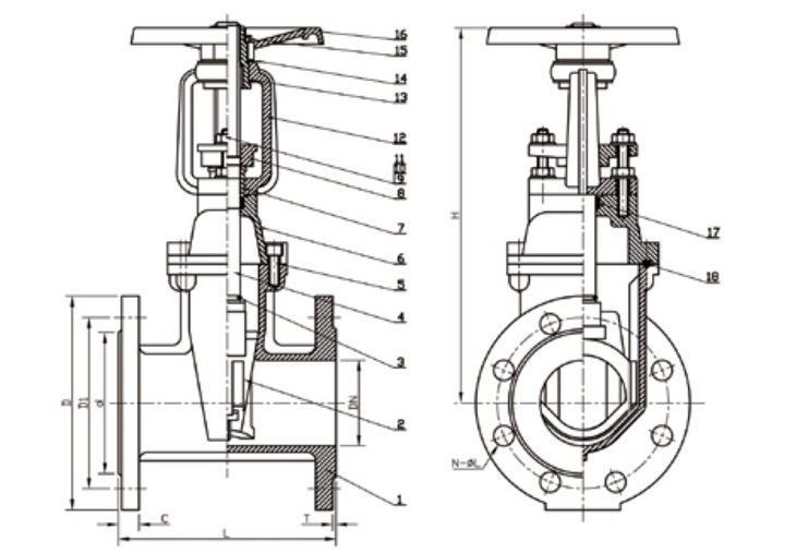 8、 閥桿螺母與閘板兩體式結構,保證足夠自由度,啟閉靈活并無卡阻現象。